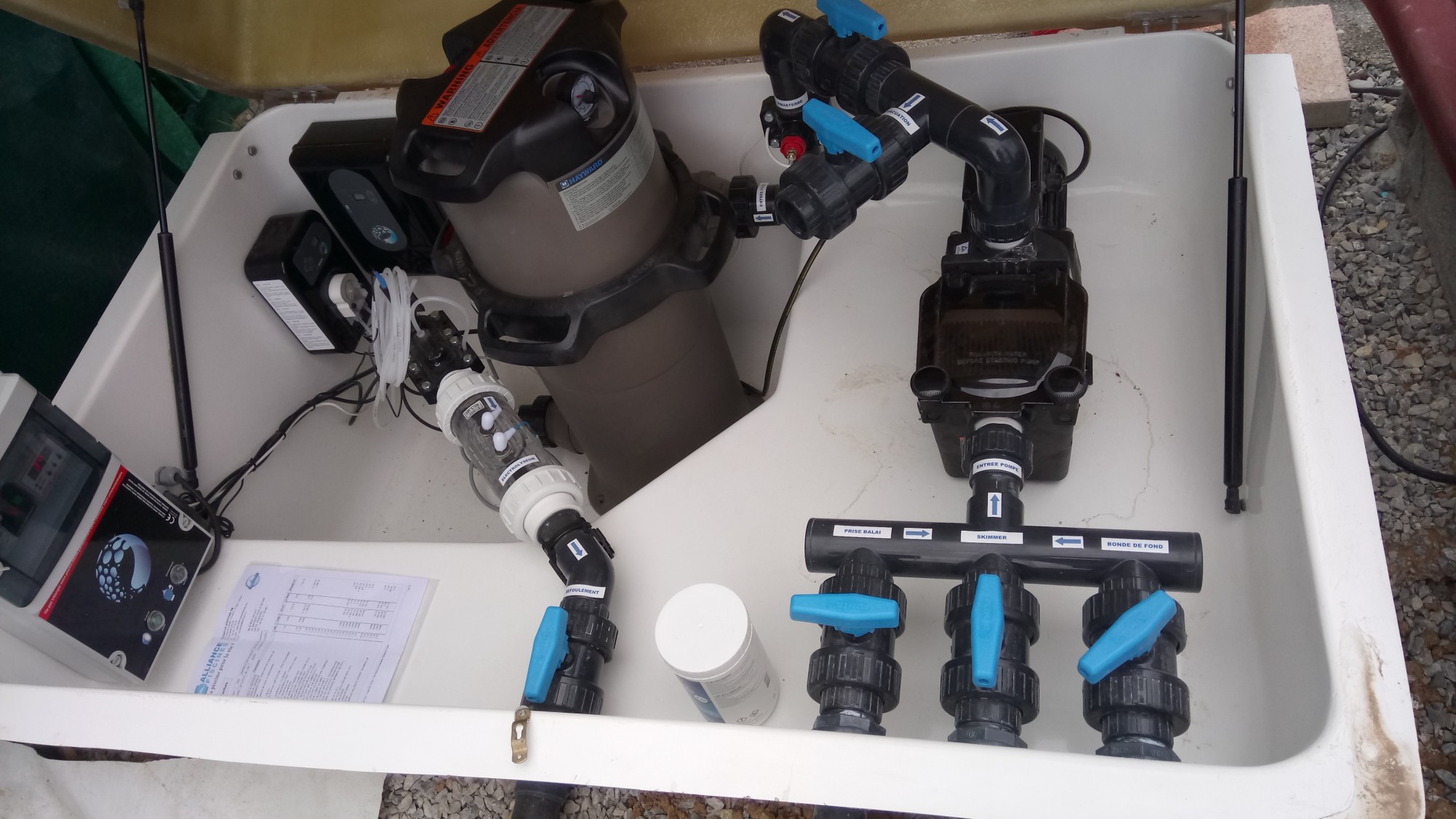 Le local technique à été integré dans un local enterré en polyester pour un gain de place et un maximum de discrétion. Nous y avons intégré le système de filtration (avec filtre à cartouche) mais aussi les appareils de traitement automatique tel que l'électrolyseur au sel et le régulateur de ph.