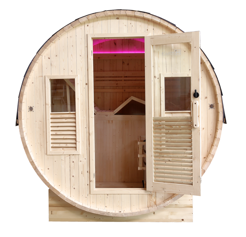 L'esthétique scandinave de cette cabine apportera une touche élégante à votre jardin, avec son bois clair en épicéa et ses dimensions compactes. Les vitres surmontées de persiennes ajoutent du caractère à la forme ronde de ce sauna d'extérieur.