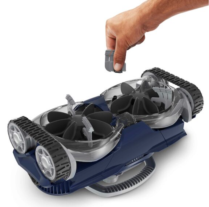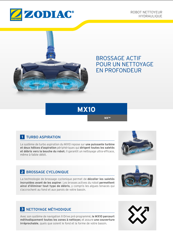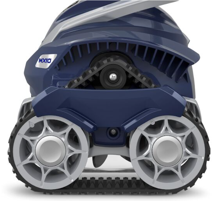 Le MX10™ de Zodiac utilise un système de turbo aspiration basé sur une turbine puissante et deux hélices d'aspiration périphériques. Ces éléments dirigent efficacement toutes les saletés et débris vers la bouche du robot, assurant ainsi un nettoyage ultra-efficace, même à faible débit.